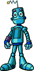 In JumpStart 3rd Grade and JumpStart Typing, Botley's body is mostly cerulean in color. Several parts of his body, such as his knee joints and shoulder blades, are dark blue. He has three different colored buttons on his chest, one red, one green, and one dark blue. His eyes are red-orange, and he has purple eyebrows. He has a yellow antenna on top of his head that flashes when he activates his "powerful sensory device", and he can extend his right hand several yards by uncoiling a purple cord at the edge of his right arm.