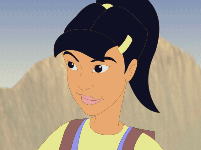 In JumpStart Adventure Challenge, her appearance is similar, but she wears a light red T-shirt and light grayish-brown sneakers. She doesn't have bangs over her forehead, but rather has long wavy bangs off to one side of her head.